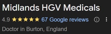 Click the image below or here to visit our Midlands HGV Medicals sister site for medicals in Burton on trent, Swadlincote, Tamworth and Lichfield. We're here to assist with your HGV, D4, C1, LGV, PCV, PSV driver medical needs. Also run by Dr Wilson.